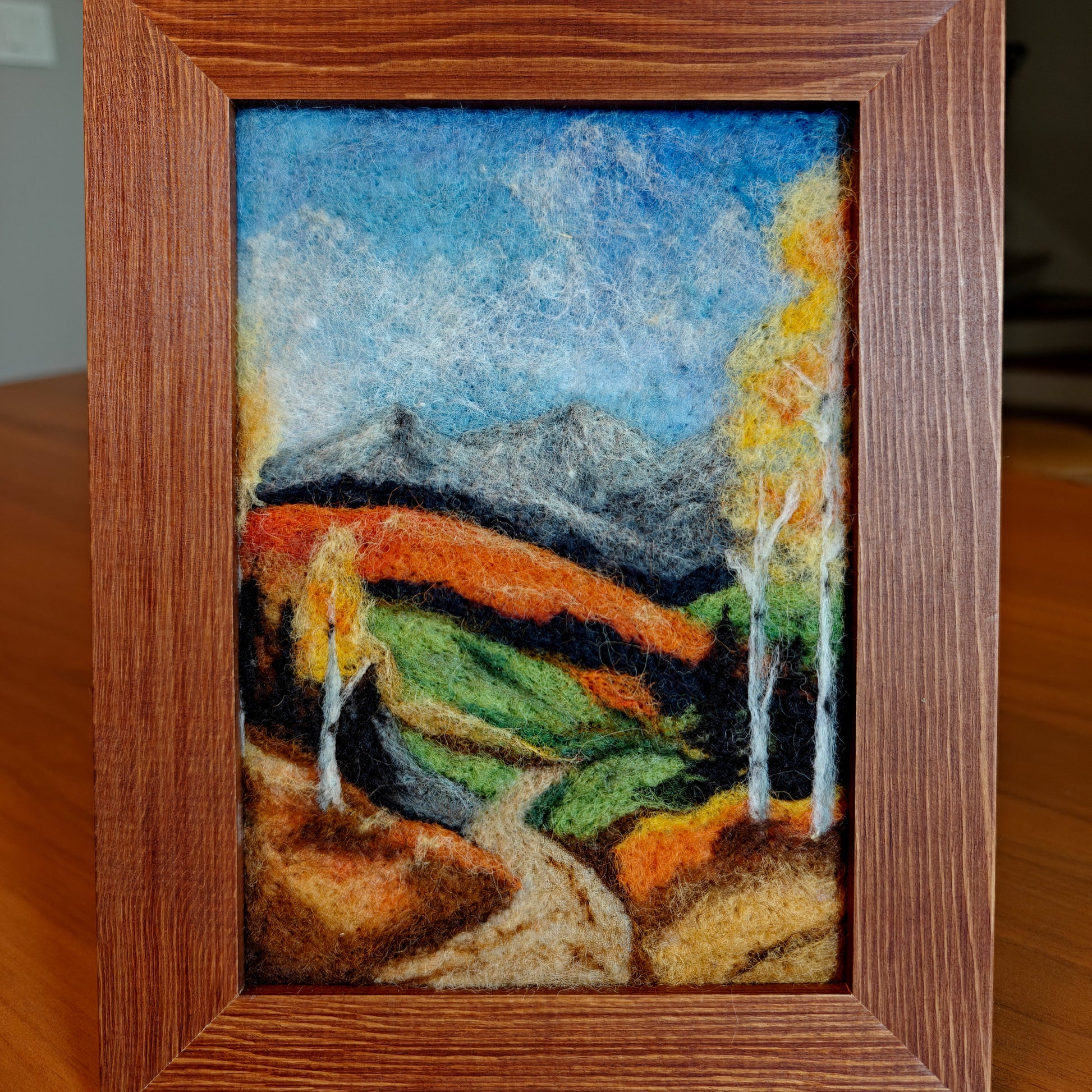 Hand-crafted needle felted fiber art of an aspen trail. Solid wood frame included. Artwork is 5"x7".