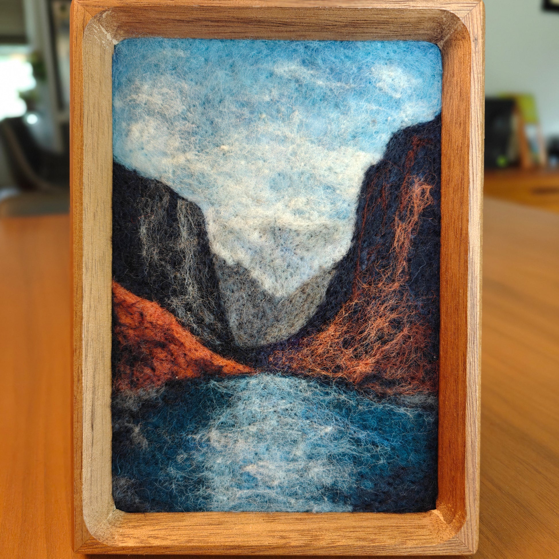 Hand-crafted needle felted fiber art of Big Bend National Park. Solid wood frame included. Artwork is 5"x7".