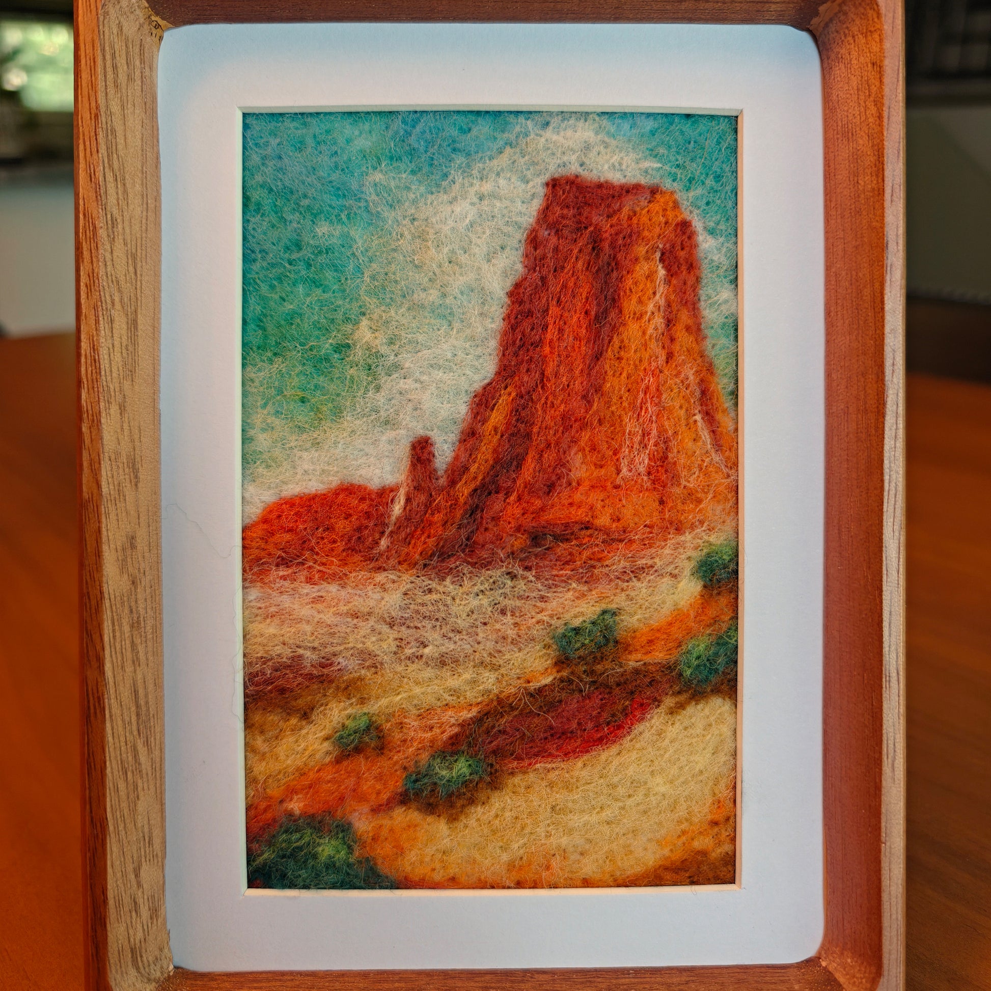 Hand-crafted needle felted fiber art of Death Valley National Park. Solid wood frame included. Artwork is 5"x7", matted to 4"x6".