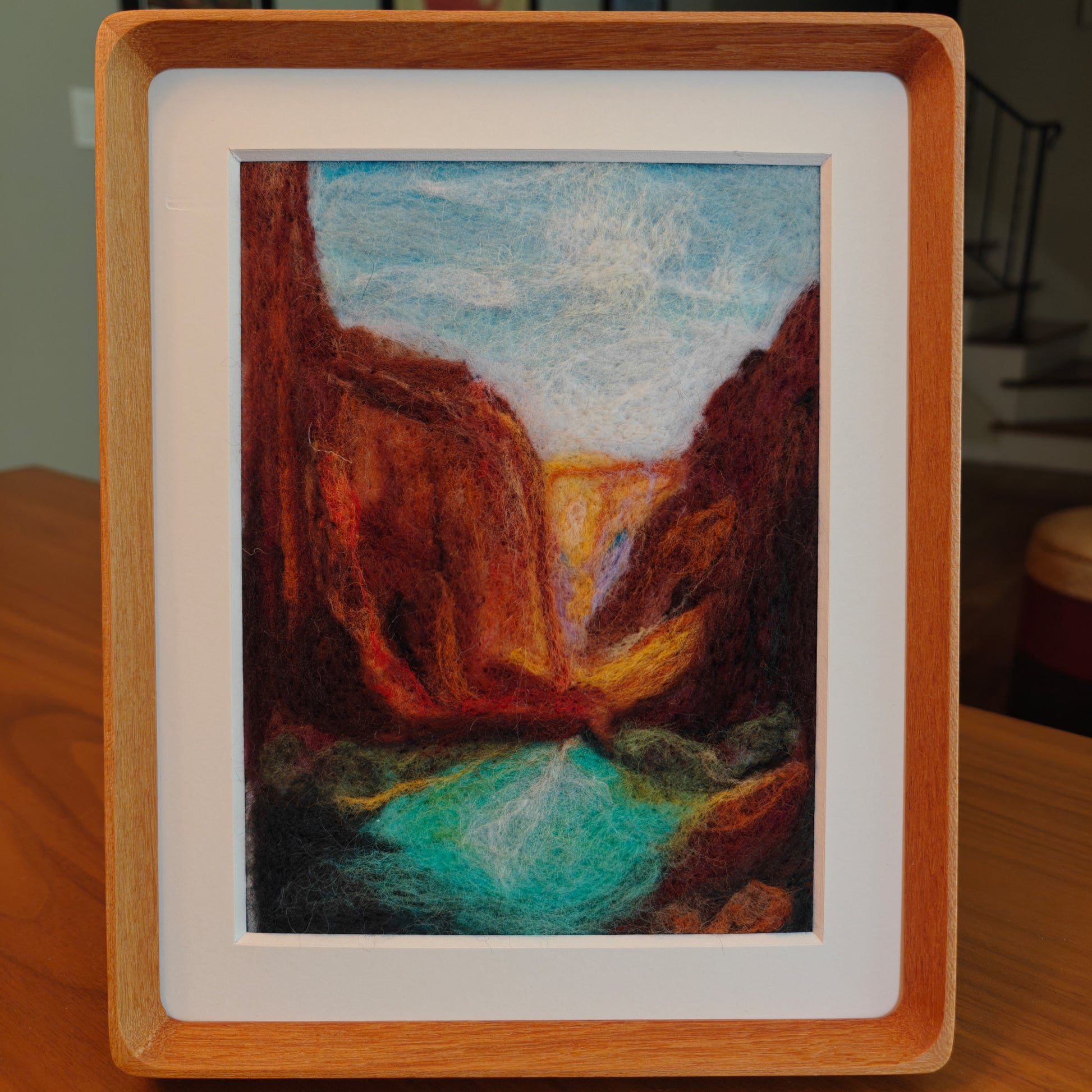 Hand-crafted needle felted fiber art of the Grand Canyon. Solid wood frame included. Artwork is 6"x8".