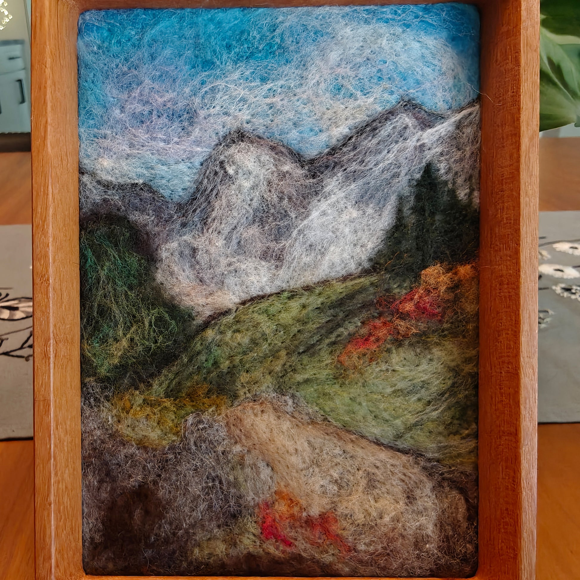 Hand-crafted needle felted fiber art of North Cascades National Park. Solid wood frame included. Artwork is 5"x7".