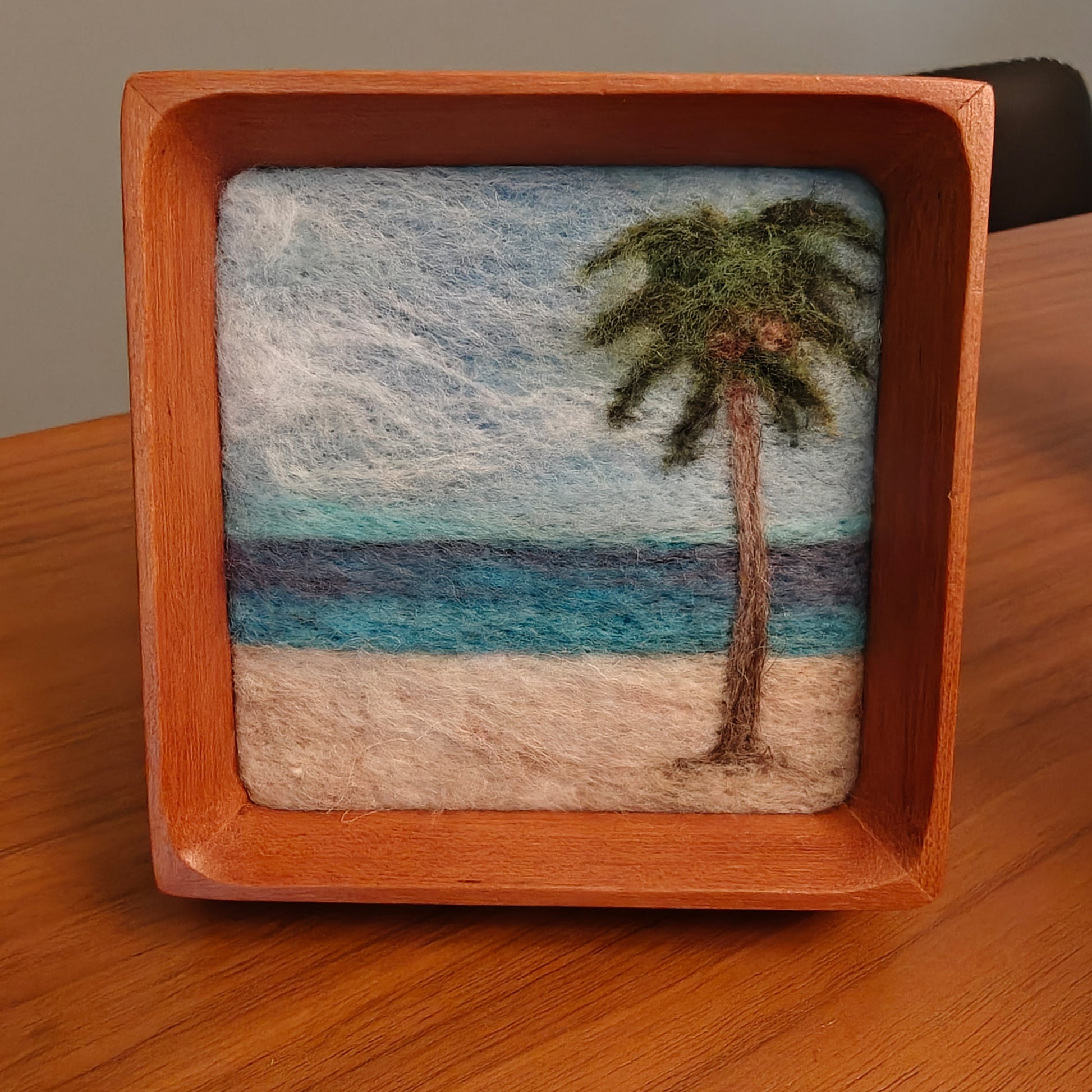 Hand-crafted needle felted fiber art of a lonely palm tree. Solid wood frame included. Artwork is 4"x4".