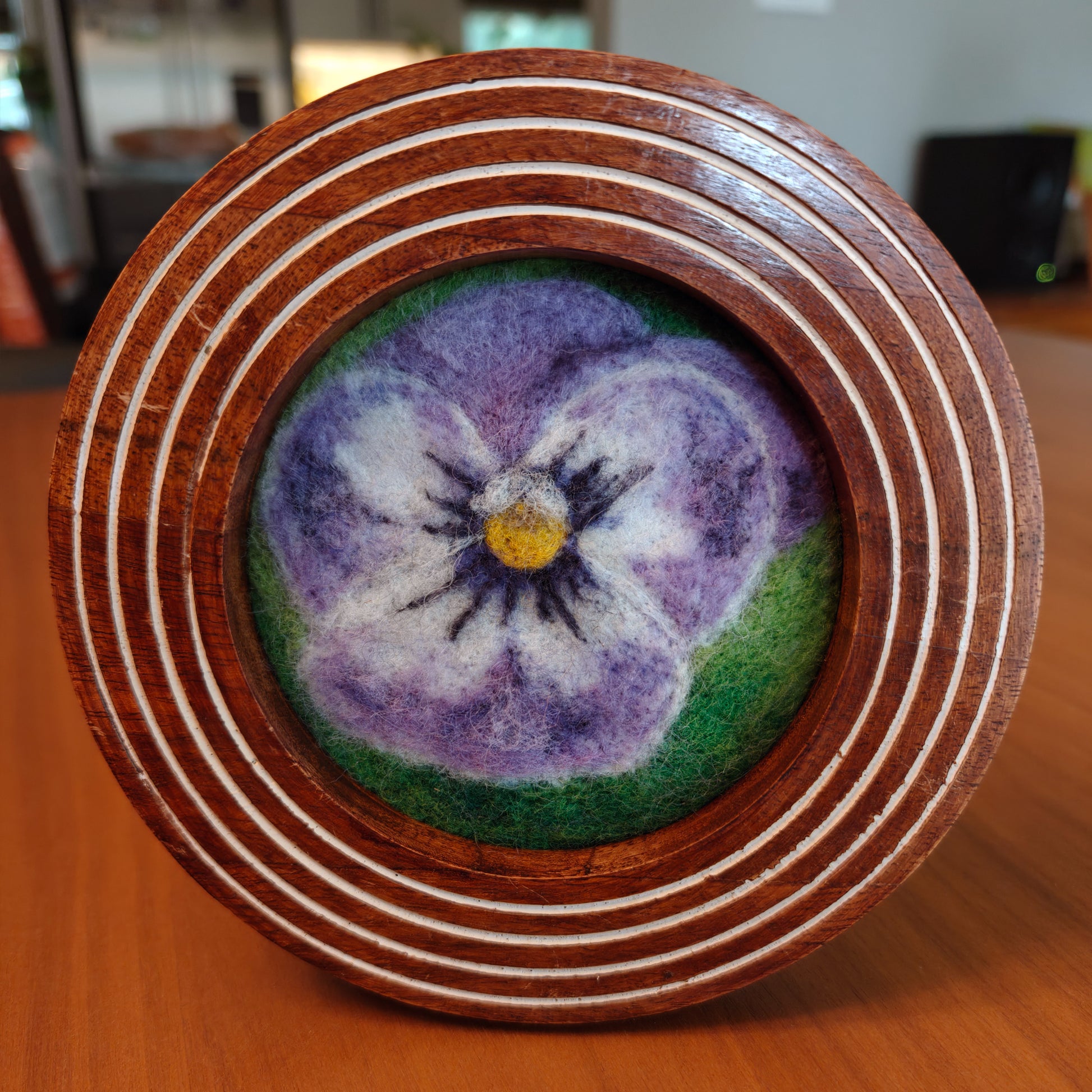 Hand-crafted needle felted fiber art of a pansy. Solid wood frame included. Artwork is 4"x4".