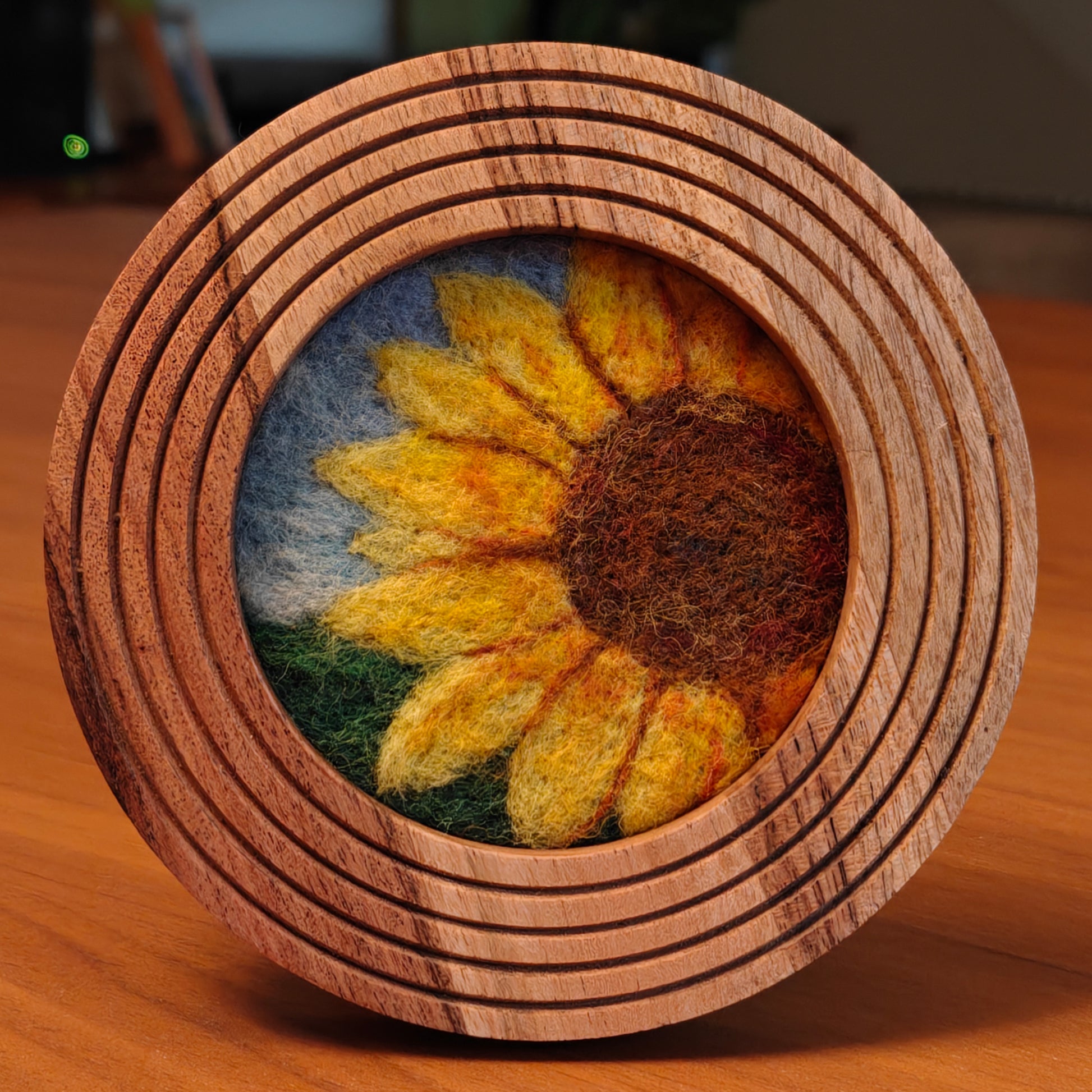 Hand-crafted needle felted fiber art of a sunflower. Solid wood frame included. Artwork is 4"x4".