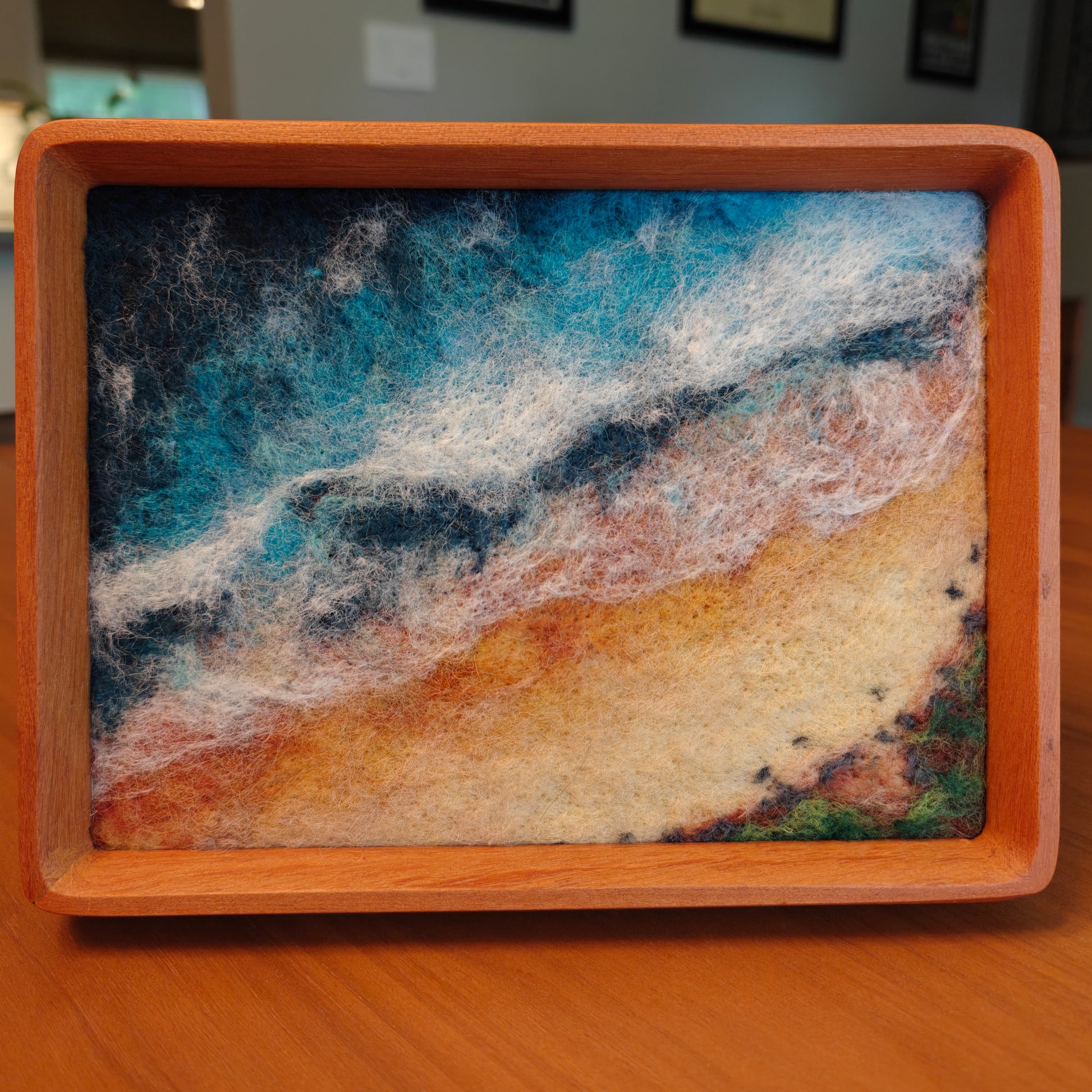 Hand-crafted needle felted fiber art of waves rolling in on the beach. Solid wood frame included. Artwork is 6"x8".